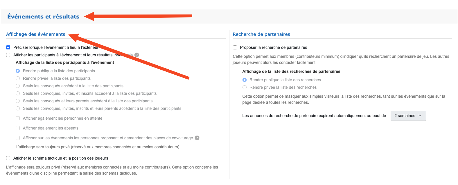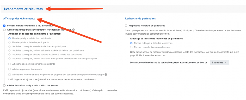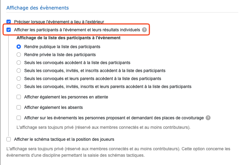 Vous avez la possibilité, sur la page d’un événement, d’afficher les participants à celui-ci. Pour se faire, il faut activer cette option en se rendant dans « Paramétrages > Réglages des pages du site ». Descendez ensuite dans la partie « Événements et résultats ». Dans la colonne de gauche se trouve la sous-partie « Affichage des évènements » :