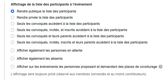 Une fois cette option cochée, vous pouvez choisir qui peut voir la liste des participants (la liste peut être publique, privée, visible uniquement des convoqués, etc.), et si également vous souhaitez afficher dans cette liste, en plus des personnes présentes, les personnes n’ayant pas encore répondues à leur convocation, les personnes absentes ou encore les personnes proposant / demandant des places de covoiturage :