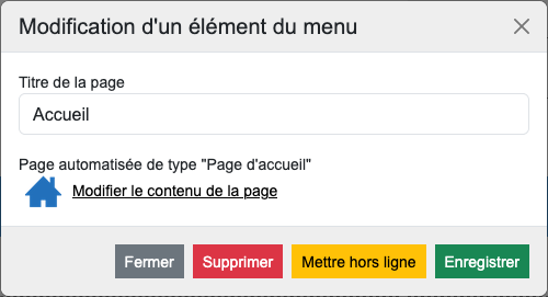 Pour avoir un QR Code menant vers la page d’accueil de votre site, rendez-vous dans « Contenu > Menus & pages » et passez votre souris sur l’élément (sur fond gris) « Accueil » :